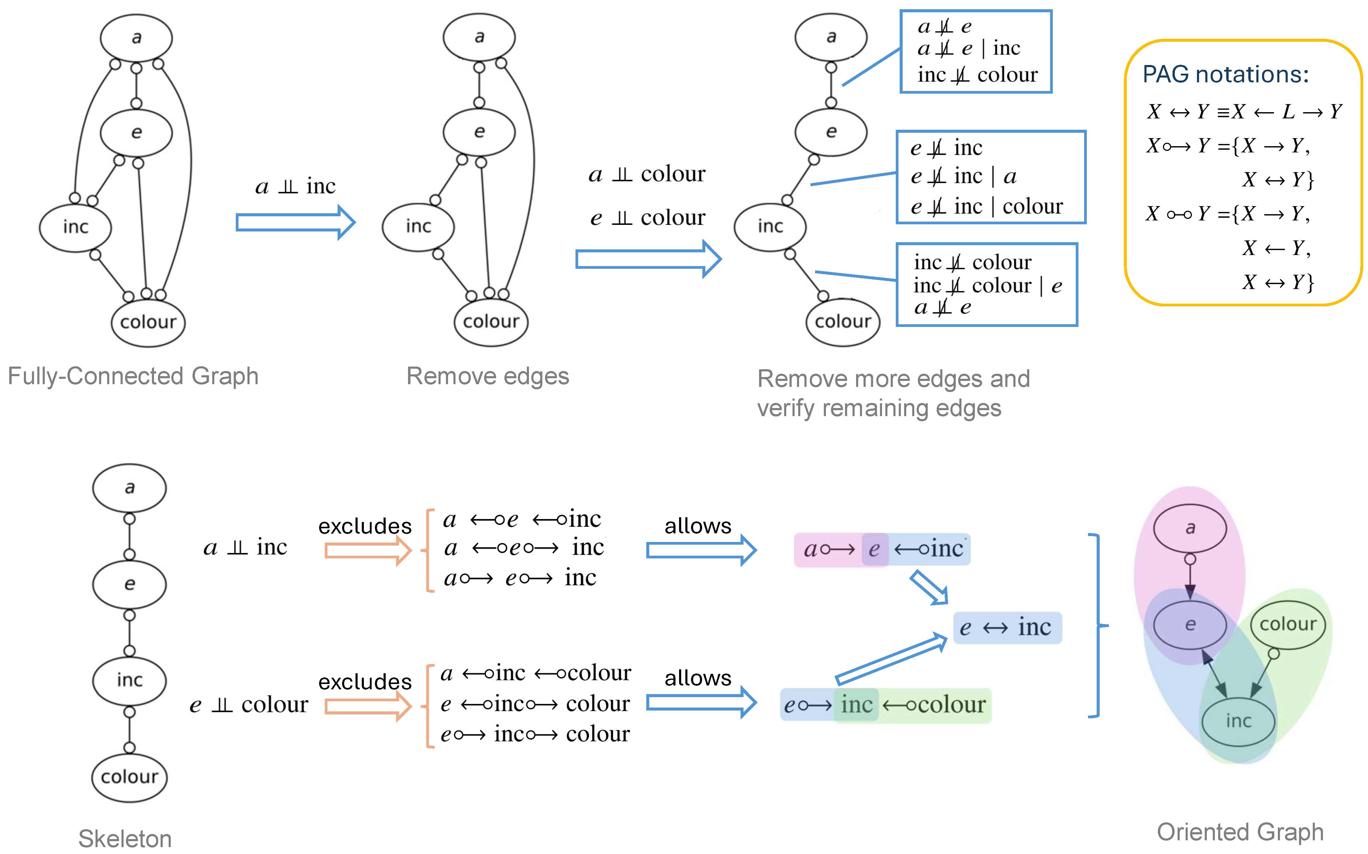 The visualization of the FCI algorithm for the orbital elements (plus color) of trans-Neptunian objects. In FCI stage i (upper panel), the algorithm starts with a fully connected graph where all nodes are interconnected to allow all possible cases. Then, the algorithm goes through every edge and removes an edge when two nodes are independent, and when two nodes become conditionally independent given some subset of other variables. In FCI stage ii (lower panel), the remaining edges are oriented by constraining the ending symbols of each edge according to CIs.
